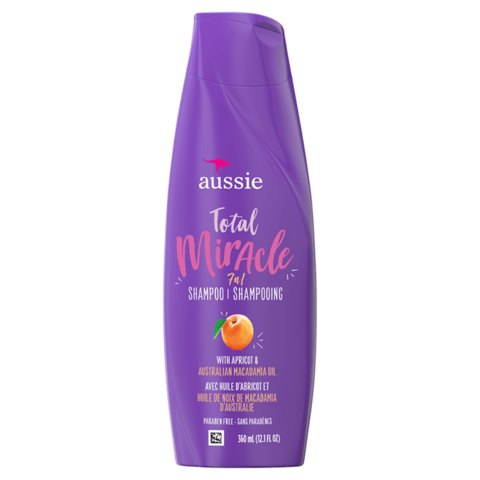 Aussie Total Miracle Shampoo é infundido com damasco e óleo de macadâmia australiano para manter seu cabelo lindo com 7 benefícios saudáveis: fortalecimento contra danos, maciez, proteção contra pontas duplas, umidade, controle de umidade, brilho e alisamento.