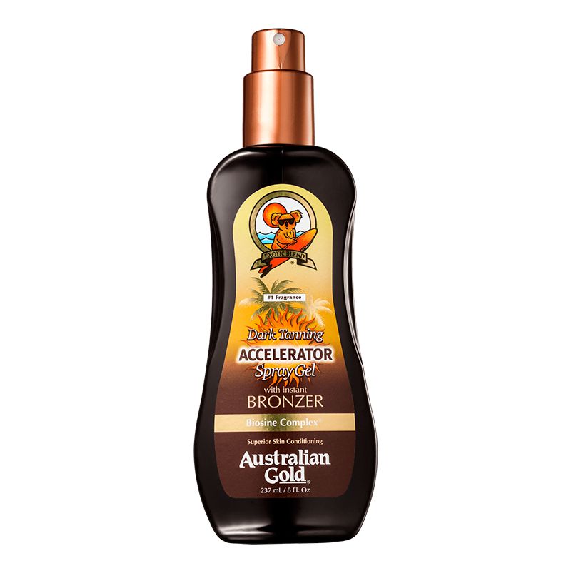Australian Gold Accelerator Dark Tanning Instant Bronzer Spray Gel Bronzeador é um acelerador do bronzeado que promove um efeito dourado instantâneo. Sua fórmula em spray gel facilita a aplicação e absorção do produto.