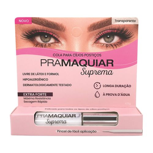 A cola para cílios PRAMAQUIAR Suprema é indicada para todos os tipos de cílios postiços. Possui formulação extra-forte, com máxima resistência e secagem rápida. Sua fórmula é livre de látex e formol, perfeita para pessoas com maior sensibilidade e alergias.