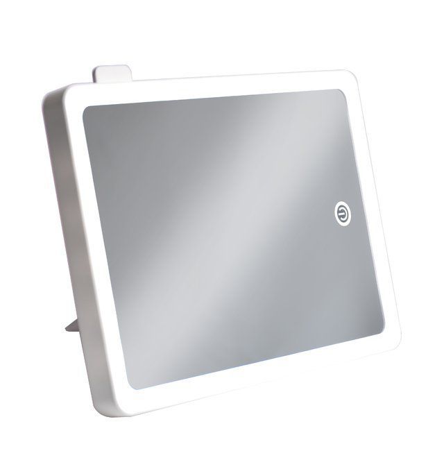 Espelho para maquiagem com botão touch screen e luz de led. Possui entrada USB para ser diretamente