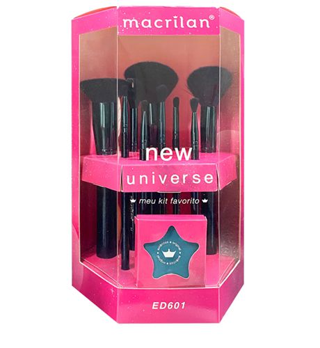 Kit New Universe ED601 Macrilan, especialmente desenvolvido com 09 pincéis de cerdas sintéticas para aplicação de maquiagem líquida, cremosa ou em pó. Pincéis com cerdas super macias e formatos que permitem um acabamento suave e impecável. O Kit também possui uma esponja extra macia em formato de estrela para aplicação de base, pó ou corretivo. A qualidade Universe que você já conhece, com um novo universo de possibilidades para a sua maquiagem ideal.