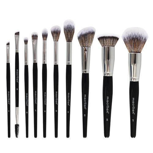 Kit Profissional Max A100 da Macrilan feito com 10 pincéis profissionais para aplicação completa de maquiagem, tanto com produtos líquido, cremosos ou em pó. Os pincéis são fabricados com cerdas super macias e duplamente polidas. Os formatos especiais de cada pincel proporcionam um resultado profissional e impecável na maquiagem.