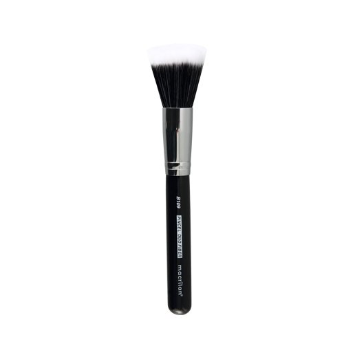 Pincel Macrilan B109, especialmente desenvolvido para aplicação de blush em pó ou cremoso, base líquida ou cremosa, bronzer e iluminador. Também pode ser utilizado para polimento e acabamento. Feito com dois tipos de cerdas sintéticas especiais para um resultado suave e uma maquiagem impecável.