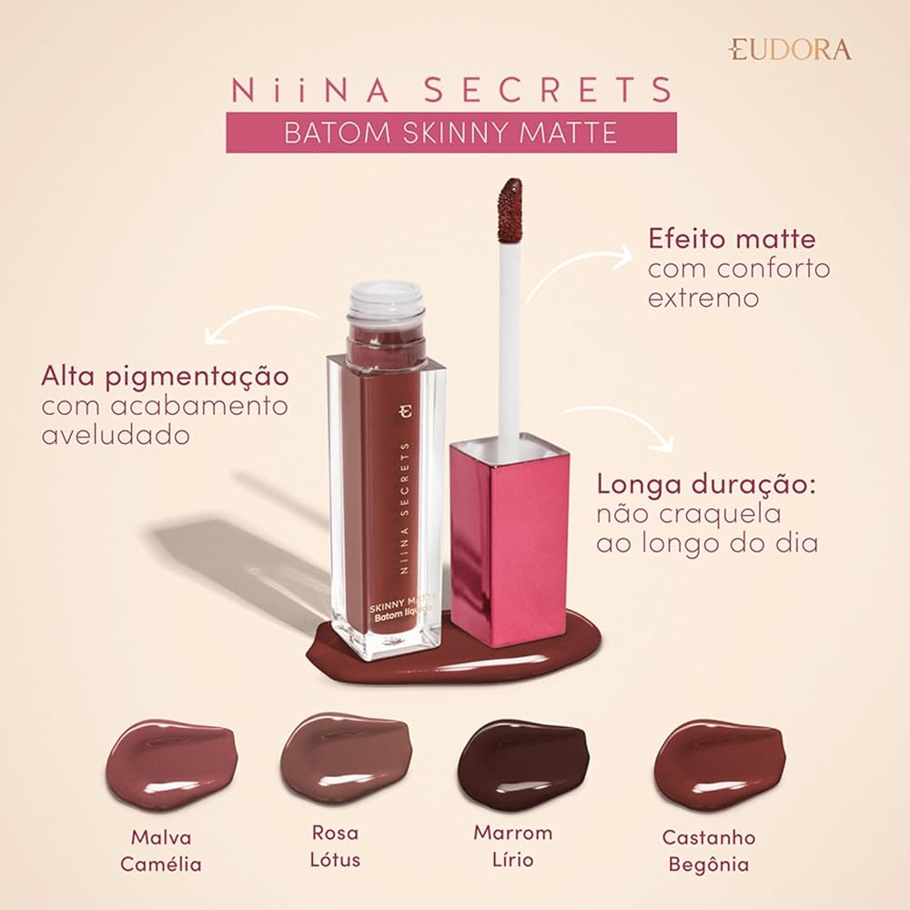 Niina Secrets Skinny Matte é a revolução do batom líquido. Possui alta pigmentação, textura ultrafina e efeito mate aveludado. Nem parece que esta de batom!