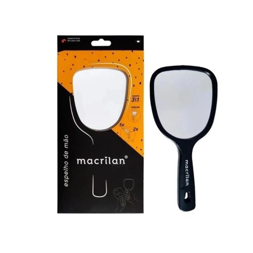 Espelho Triplo de Mão da Macrilan, especialmente desenvolvido com 3 espelhos, um com visualização natural, um com aumento 2X e um com aumento 5X, indicado para visualização do rosto e da pele com maior facilidade e praticidade.