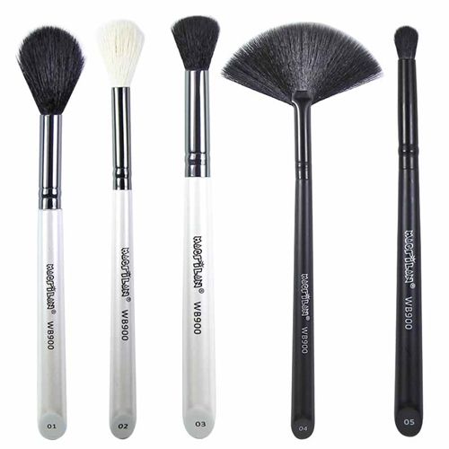 1. Pincel para pó: Aplique pó facial ou pó translúcido em todas as áreas da face, pescoço e colo.
