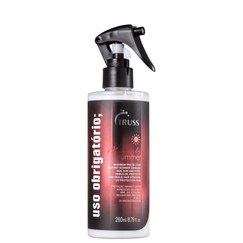 Truss Miracle Summer Uso Obrigatório tem proteção UV e pode ser usado antes da exposição ao sol ou após curtir um dia na praia ou piscina, pois sua fórmula tem agentes capazes de devolver ao cabelo todo o brilho e maciez.