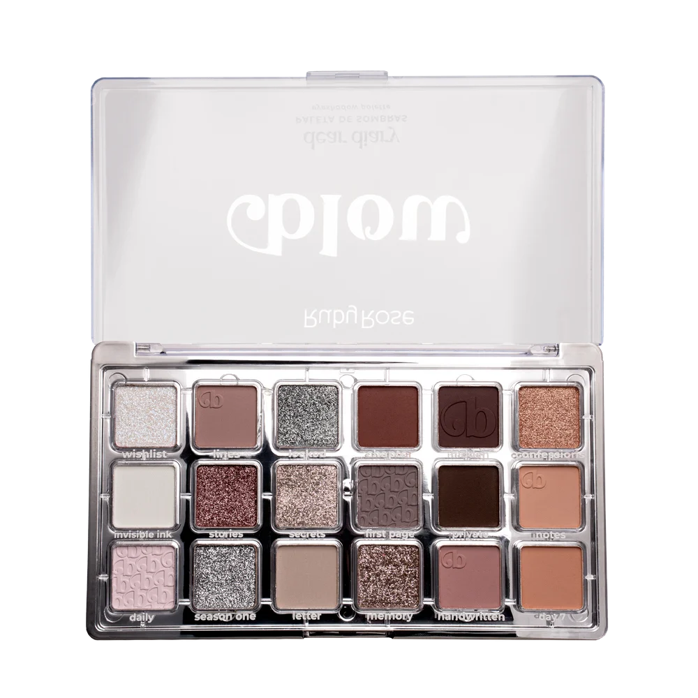 A paleta Dear Diary apresenta um elegante mix de tons suaves e intensos, incluindo nude, cinza, prata, dourado e marrom, ideal para produções
