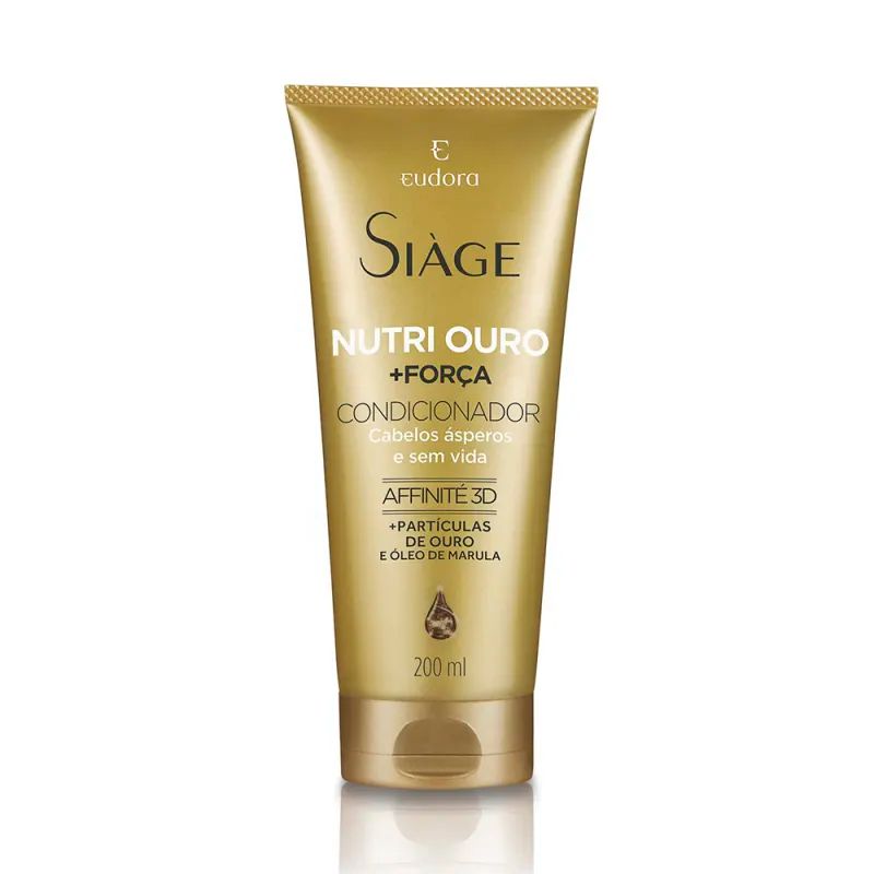 Você procura força extrema e nutrição para o seu cabelo? A linha SIÀGE NUTRI OURO garante isso e muito mais! EUDORA SIÀGE é uma linha completa de hidratação capilar que conta com a exclusiva tecnologia Affinité 3D, que envolve o fio e leva os ativos para o seu interior, liberando-os gradualmente. Desde a primeira aplicação você nota maciez, fios encorpados e os cabelos 3x mais fortes. Com ação antioxidante, a linha Siáge Nutri Ouro recupera a espessura dos fios, devolve o volume e oferece nutrição da raiz às pontas. Enriquecida com partículas de ouro e óleo de Marula, reconhecido por conter 4x mais vitamina C que a laranja, suas fórmulas garantem 3x mais força desde a primeira aplicação, além de deixar o cabelo sem frizz e com uma maciez instantânea. O condicionador Eudora Siàge Nutri Ouro é compatível com cabelos ásperos e sem vida, desembaraça os fios deixando-os macios, sedosos e com nutrição imediata após a aplicação, sendo uma ótima opção de cronograma capilar. Através de testes instrumentais com o uso combinado de shampoo, condicionador, máscara e leave-in da linha Siàge Nutri Ouro, Eudora garante: a nutrição é enriquecedora e imediata!