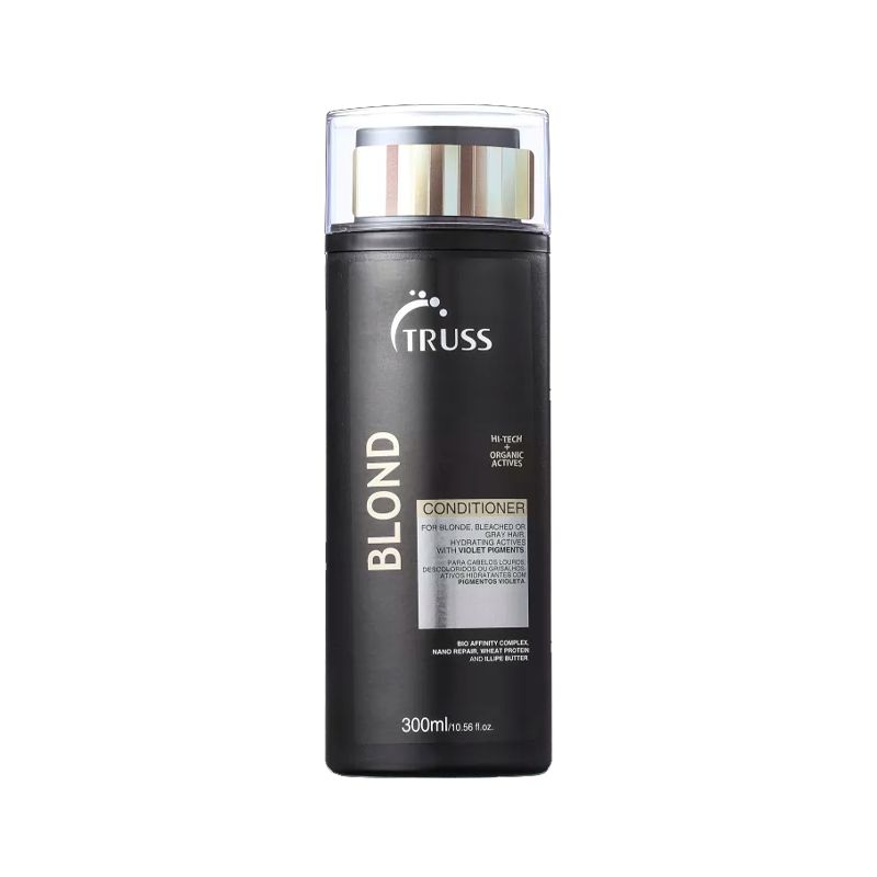 Truss Blond Conditioner contém pigmentos violetas que eliminam o amarelamento da oxidação dos fios, causado pela exposição ao sol, uso de ferramentas de calor e demais agressões. Além disso, possui tecnologia que trata os fios de dentro para fora. Ela aumenta elasticidade e sela as cutículas, o que confere maior resistência contra a quebra, além de luminosidade constante e maciez que dura o dia inteiro.