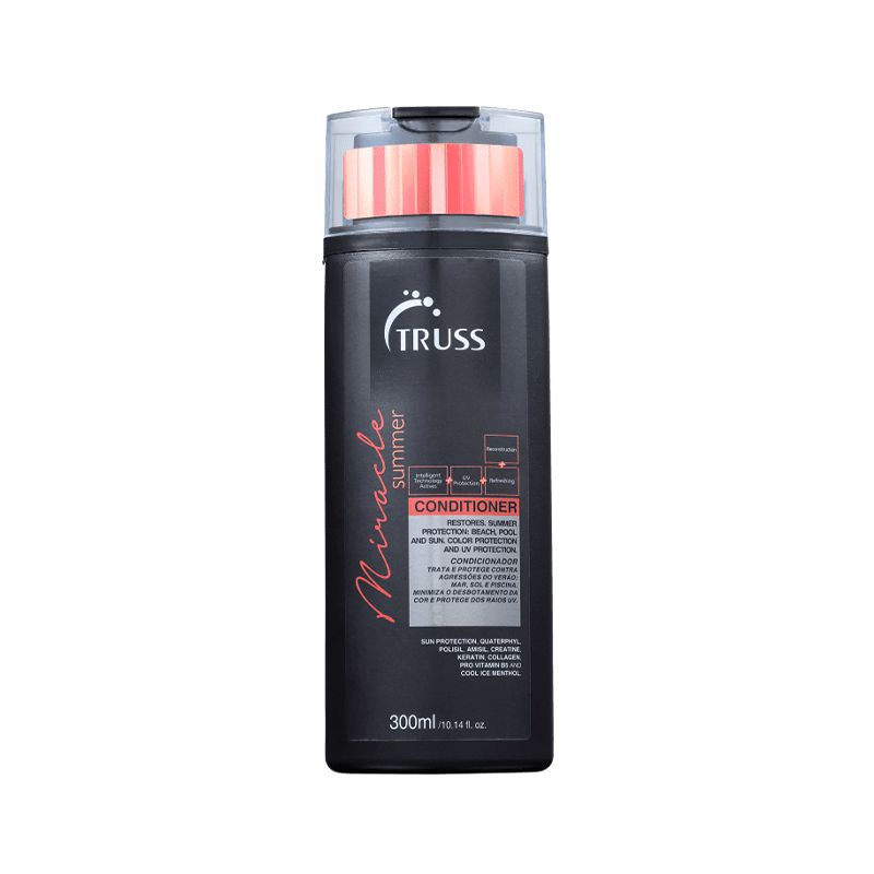 Refrescante, Truss Miracle Summer Condicionador aumenta a resistência do cabelo contra os danos causados pelos raios UV, mar e piscina enquanto melhora o pentear, recupera a vitalidade e reduz o frizz. Assim, seus fios ficam prontos para aproveitar o verão com brilho, maciez e proteção.