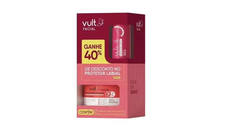 O Hidratante Creme Antissinais 7 em 1 de Vult facial oferece 48h de hidratação e conta com Vitamina E, poderoso ativo antioxidante, Niacinamida e Manteiga de Karité para uma ação antissinais que reduz rugas, linhas de expressão e deixa a pele visivelmente mais firme. Textura leve de rápida absorção e acabamento matte deixa sua pele com aspecto jovem, saudável e radiante.