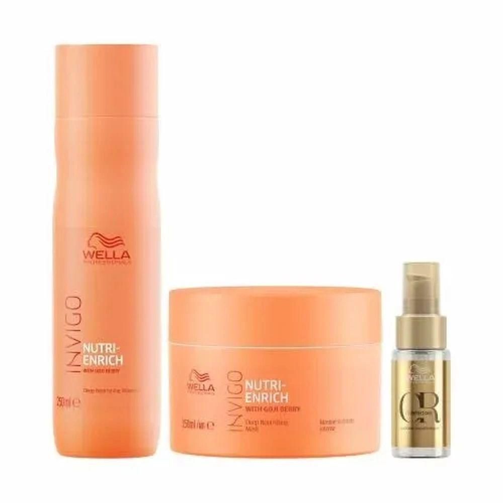 Kit Wella Professionals Invigo Nutri Enrich traz um blend de nutrientes multifuncionais que restauram a saúde e melhoram a qualidade do cabelo. A fragrância luxuosa é frutal chipre almiscarado. Seus fios ficam limpos, hidratados, nutridos e desembaraçados.