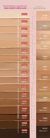 São 17 tons de base que representam a diversidade brasileira. A exclusiva tecnologia Secrets combina Óleo de rosas e vitaminas, que nutre a pele, possui ação antioxidante e auxilia a formação de colágeno. Benefícios: -Nutre a pele. -Efeito antioxidante. -Auxilia a formação do colágeno.